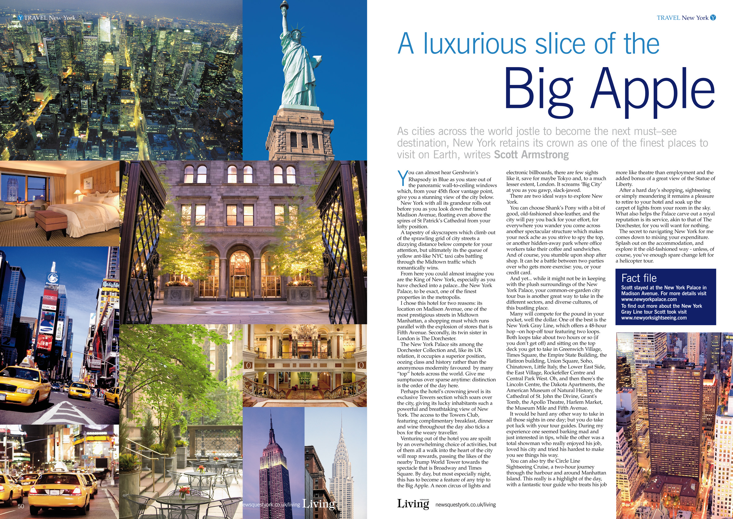 You can almost hear the strains of Gershwin’s Rhapsody in Blue as you stare out of the panoramic wall to ceiling windows which, from your 45th floor vantage point, give you a stunning view of the city below. New York with all its grandeur rolls out before you as you look down famed Madison Avenue, floating even above the spires of St Patrick’s Cathedral from your lofty position. A tapestry of skyscrapers which climb out of the sprawling grid of city streets a dizzying distance below compete for your attention, but ultimately its the queue of yellow ant-like NYC taxi cabs battling through the Midtown traffic which romantically wins. From here one could almost imagine they are the King of New York, especially as you have checked into a Palace, the New York Palace to be exact, one of the finest properties in the metropolis.